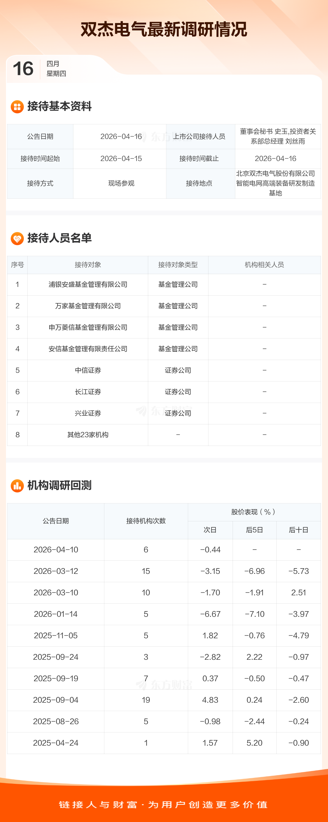 双杰电气4月16日公告称,4月15日至4月16日接待浦银安盛基金管理有限公司等8家机构调研。接待人员包括董事会秘书 史玉,投资者关系部总经理 刘丝雨。