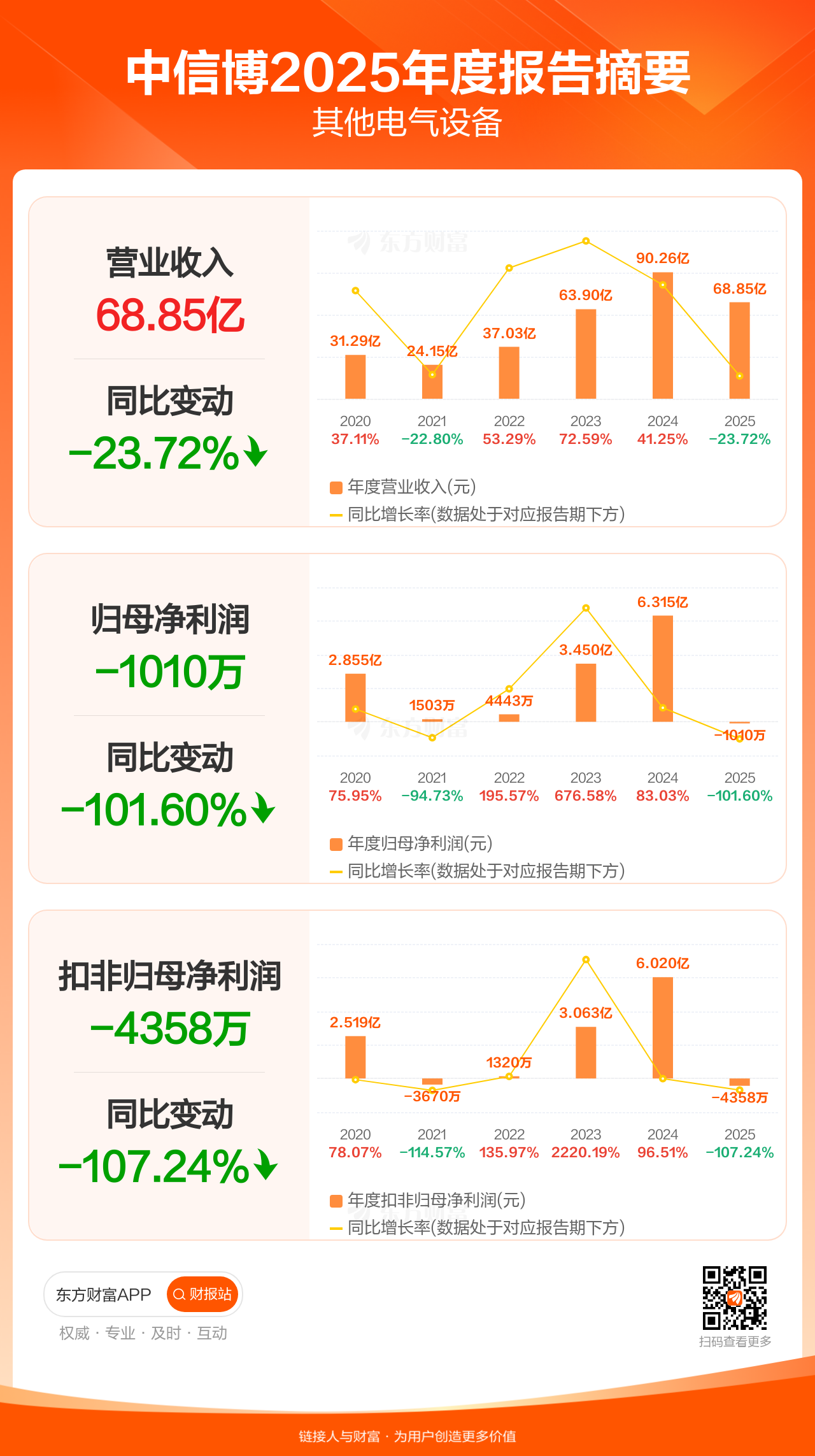 中信博4月17日发布2025年年报显示,公司全年实现营业收入68.85亿元,同比下滑23.72%;归母净利润-1010.26万元;扣非归母净利润-4358.08万元。