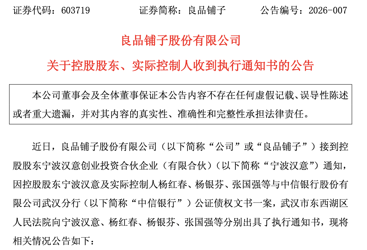 4月16日,良品铺子(603719)公告,近日,公司接到控股股东宁波汉意创业投资合伙企业(有限合伙)(简称“宁波汉意”)通知,因控股股东宁波汉意及实际控制人杨红春、杨银芬、张国强等与中信银行股份有限公司武汉分行(简称“中信银行”)公证债权文书一案,武汉市东西湖区人民法院向宁波汉意、杨红春、杨银芬、张国强等分别出具了执行通知书。