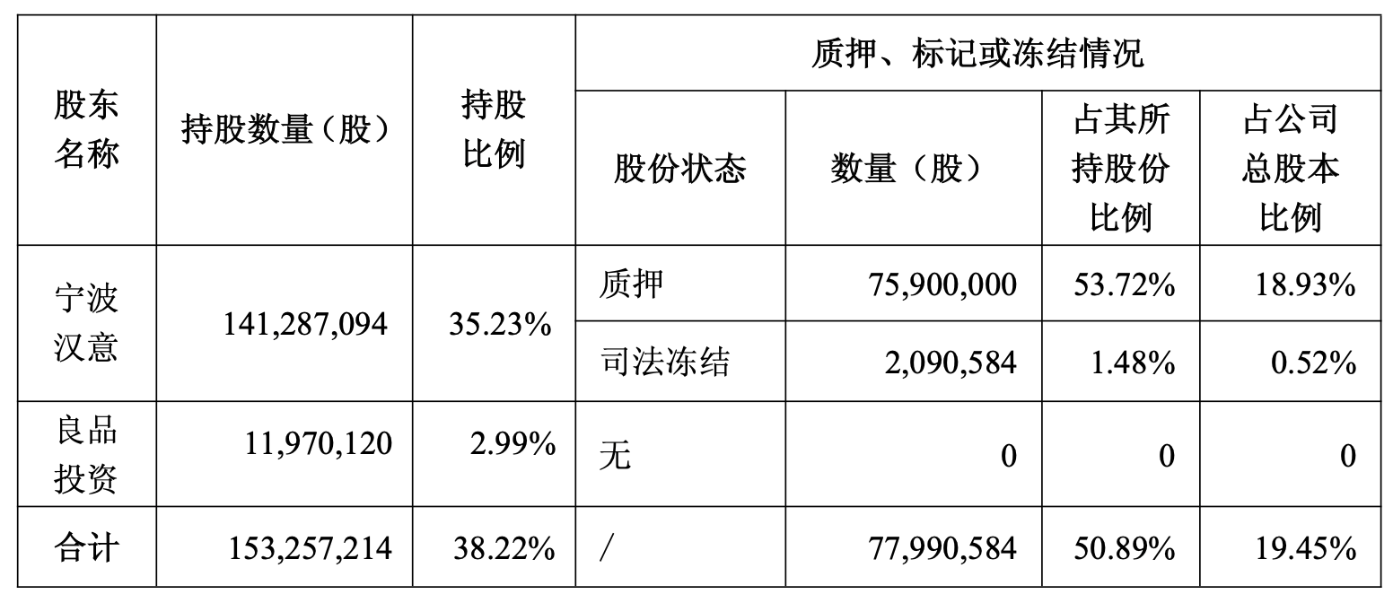 数据显示,目前,宁波汉意及其一致行动人良品投资合计持有良品铺子1.53亿股,占总股本的38.22%。其中,宁波汉意所持股份中,7590万股处于质押状态,209万股已被司法冻结,合计占其所持股份的50.89%。