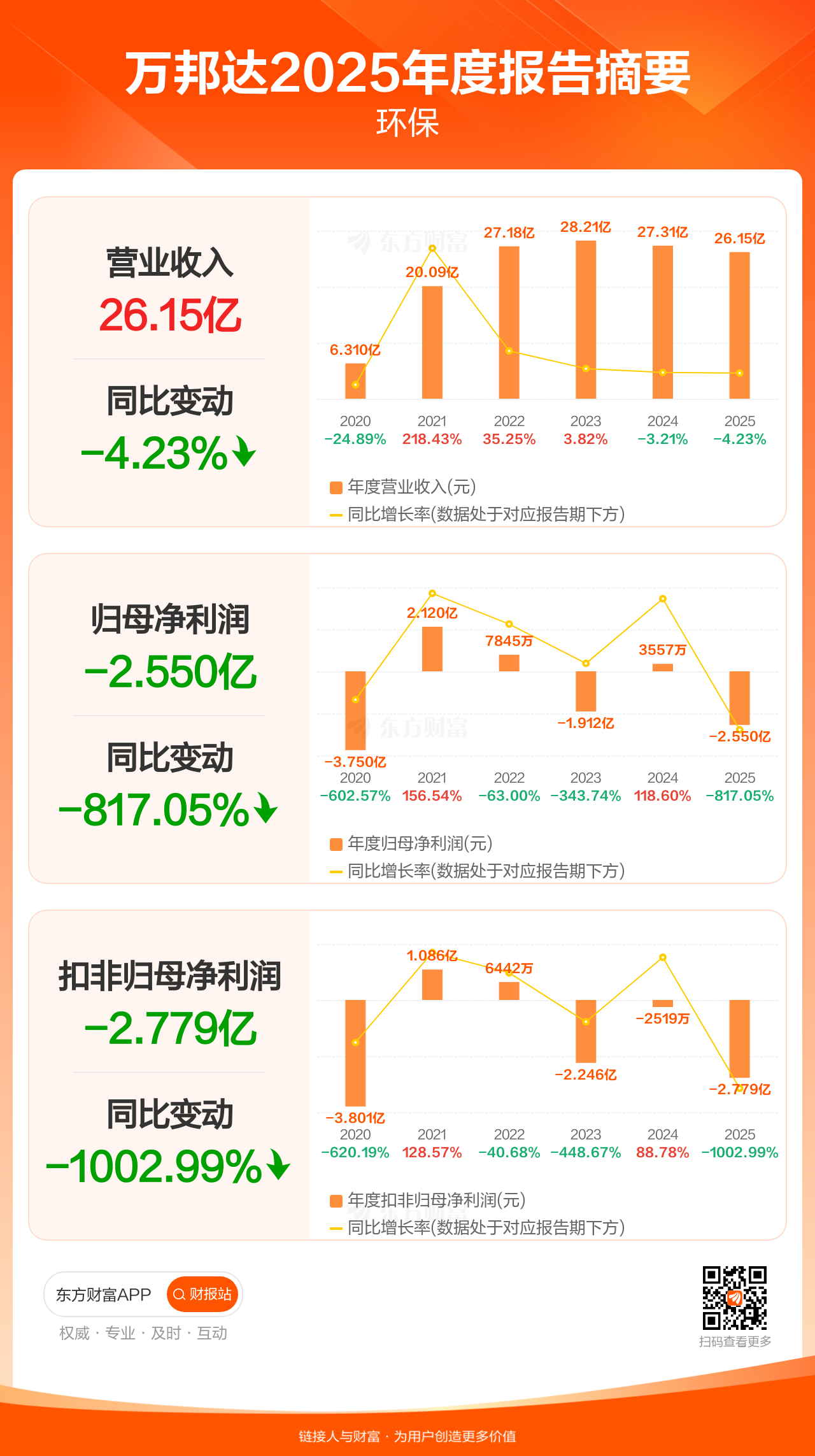 万邦达4月17日发布2025年年报显示,公司全年实现营业收入26.15亿元,同比下滑4.23%;归母净利润-2.55亿元;扣非归母净利润-2.78亿元。
