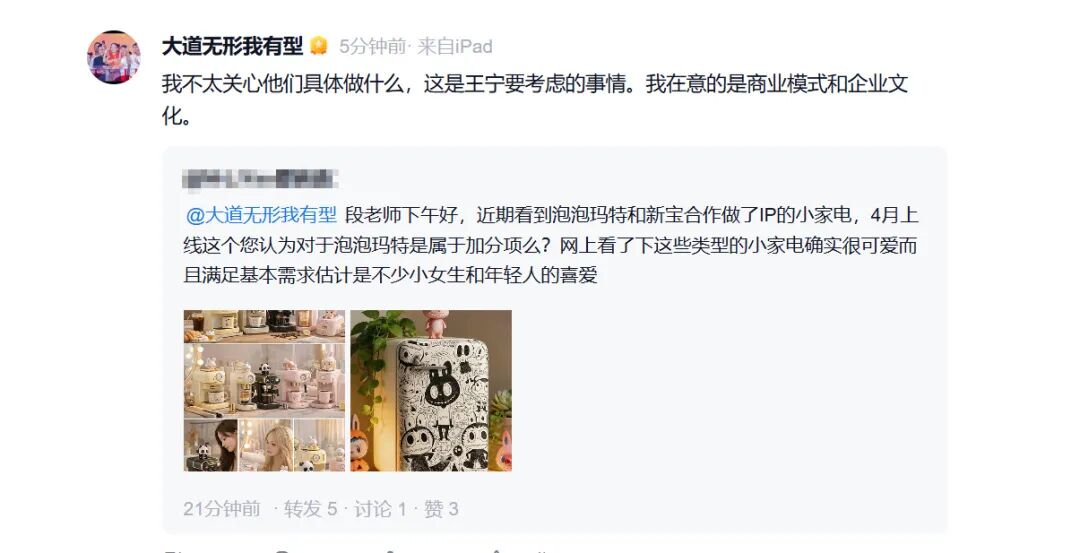 近期,泡泡玛特和新宝合作推出了IP联名小家电,有网友询问段永平的看法。段永平表示:“我不太关心他们具体做什么,这是王宁(泡泡玛特创始人)要考虑的事情。我在意的是商业模式和企业文化。”