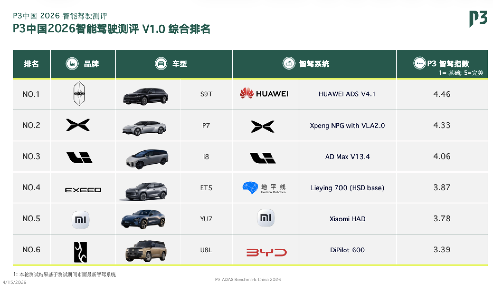 央广网北京4月16日消息 当前,辅助驾驶正从技术探索期全面迈入规模化落地的关键阶段,中国已然成为全球场景最复杂、发展最迅速的辅助驾驶市场。近日,国际知名咨询公司P3正式发布《2026P3中国智能驾驶测评报告(V1.0)》。报告显示,当前国内辅助驾驶系统梯队分化明显,以“车位到车位”为核心的用户体验正在成为头部厂商的核心赛道。