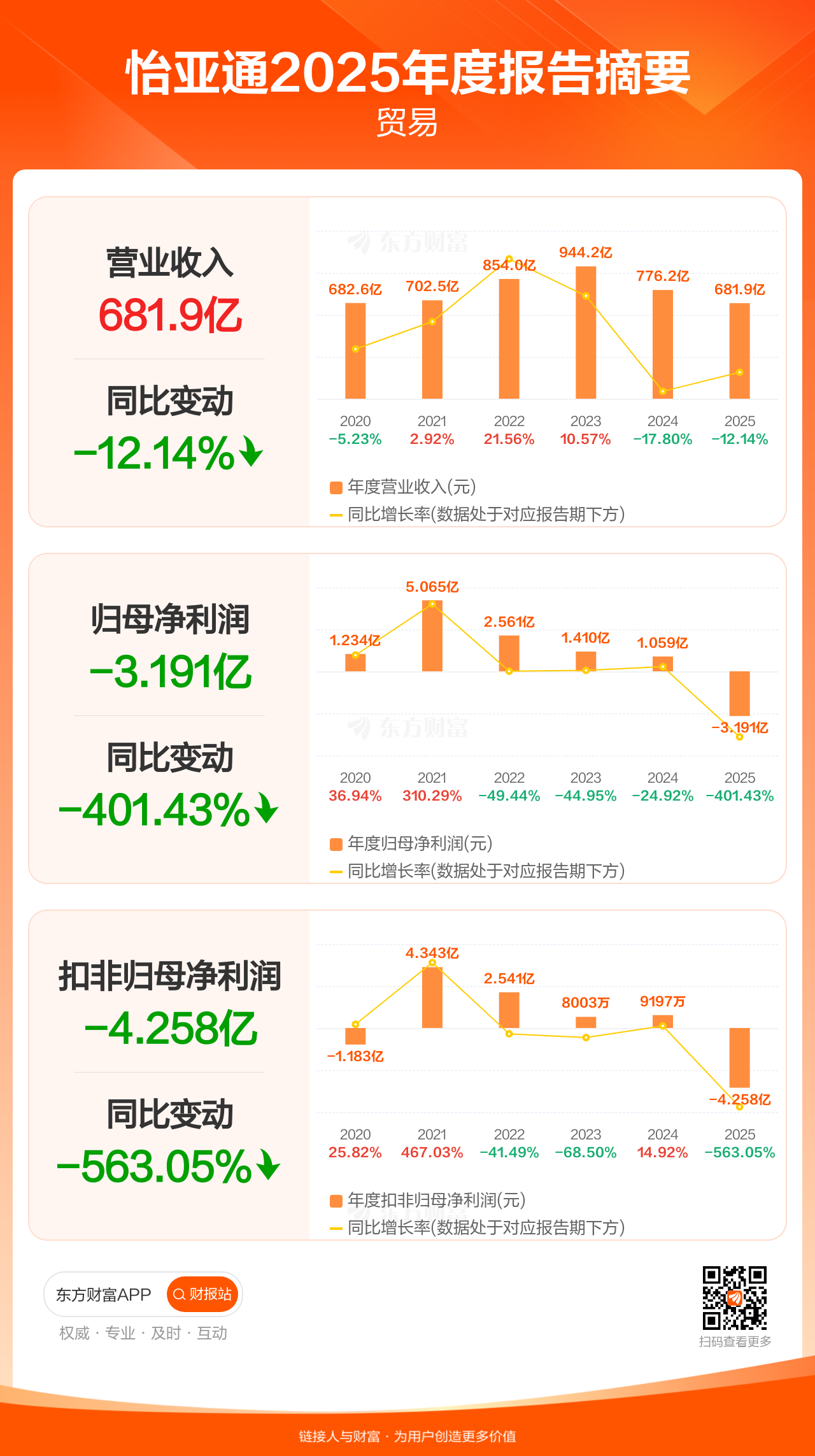 怡亚通4月17日发布2025年年报显示,公司全年实现营业收入681.94亿元,同比下滑12.14%;归母净利润-3.19亿元;扣非归母净利润-4.26亿元。