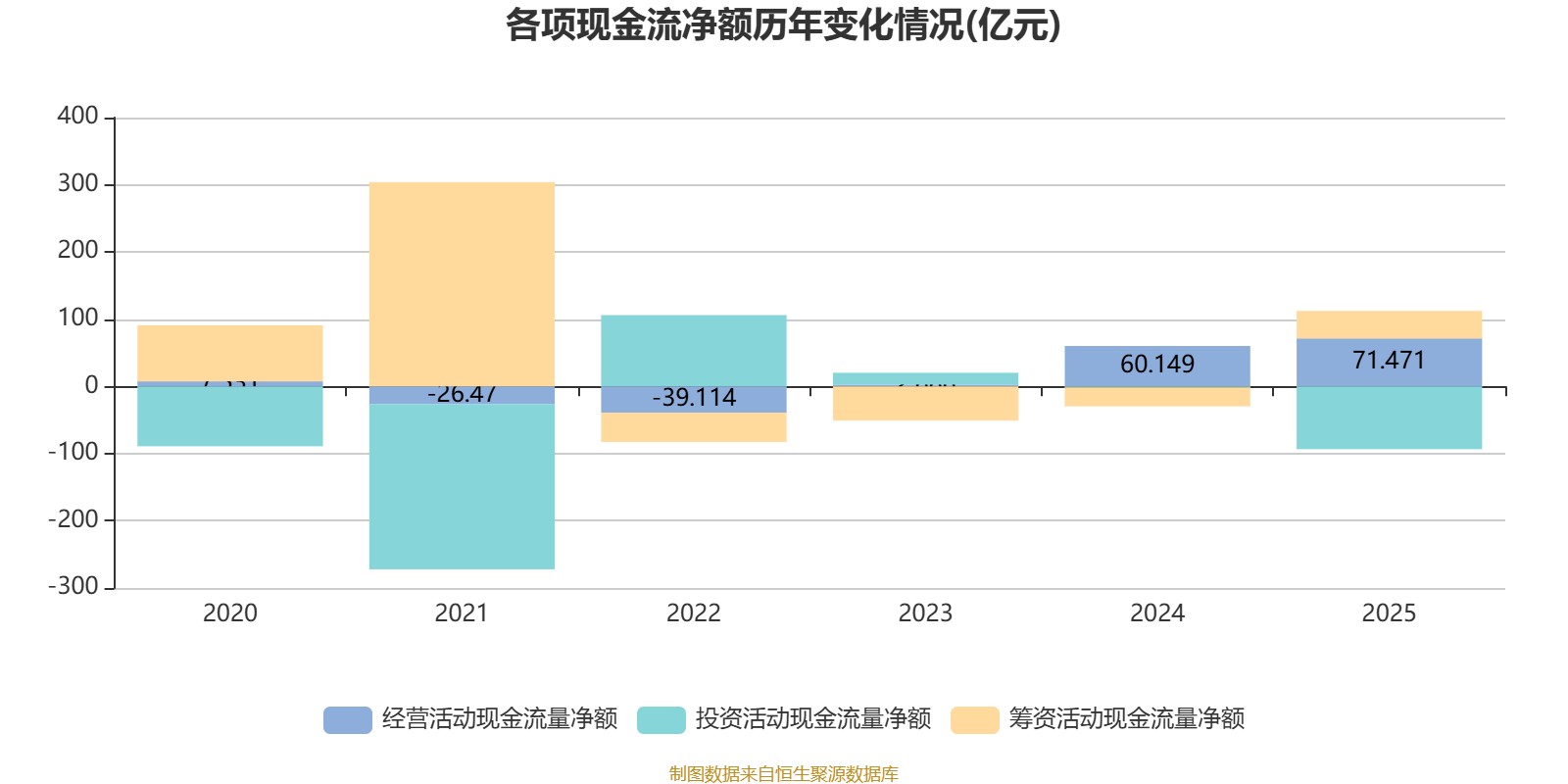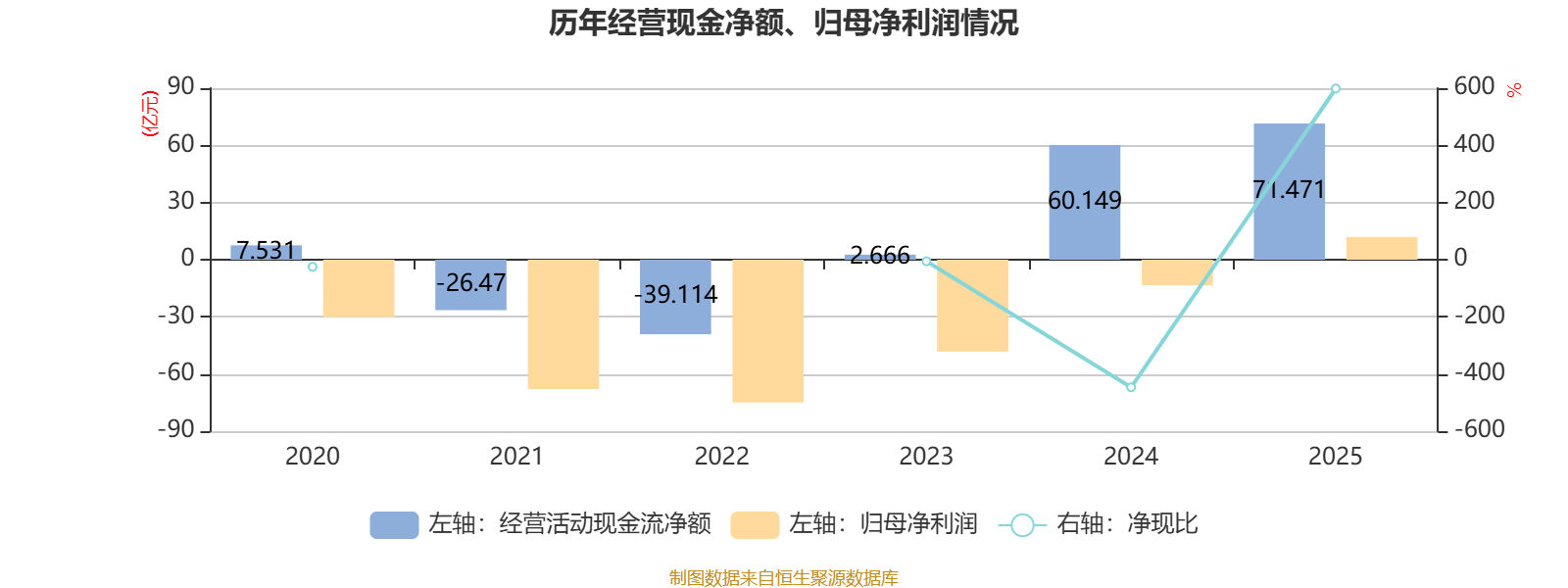 2025年,公司经营活动现金流净额为71.47亿元,同比增长410.15%;筹资活动现金流净额40.87亿元;投资活动现金流净额-93.41亿元。