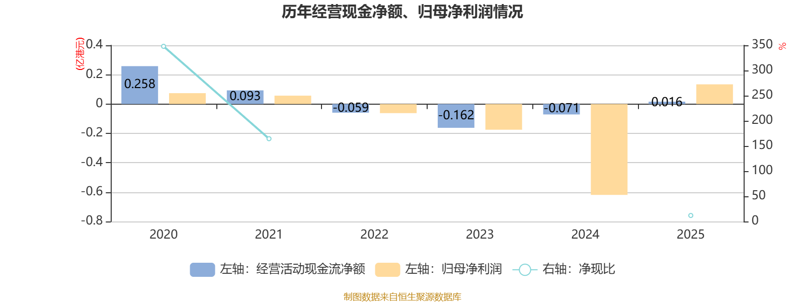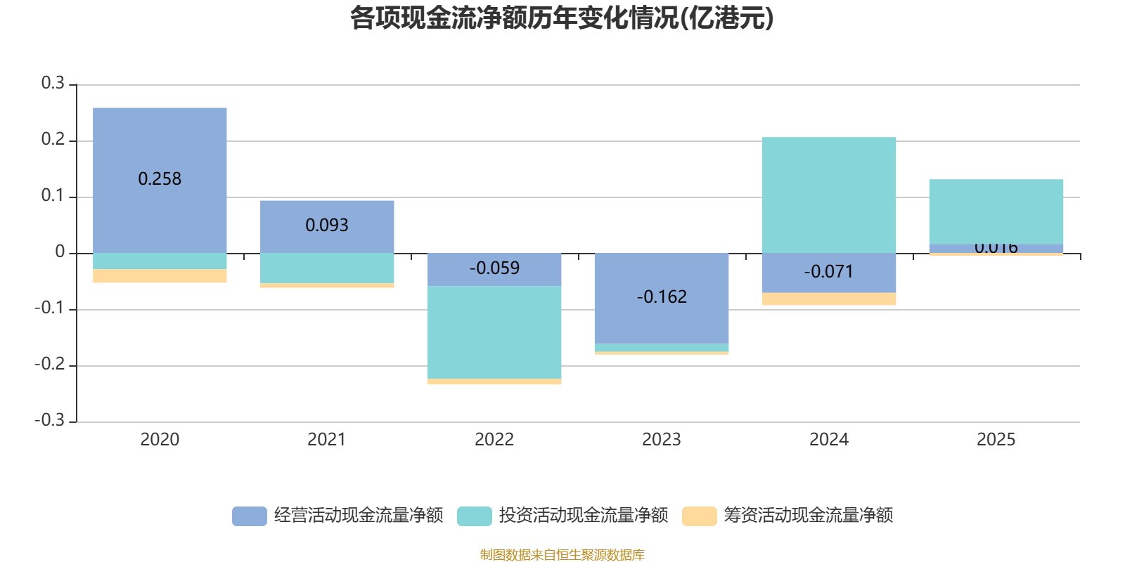 2025年,公司经营活动现金流净额为159.4万港元,同比增加864.9万港元;筹资活动现金流净额-45.1万港元,同比增加175.7万港元;投资活动现金流净额1150.6万港元,上年同期为2063.7万港元。
