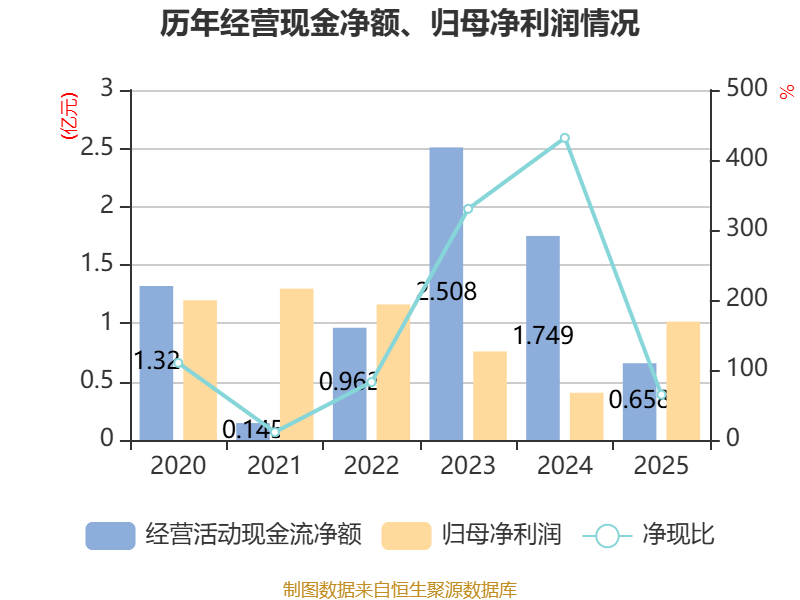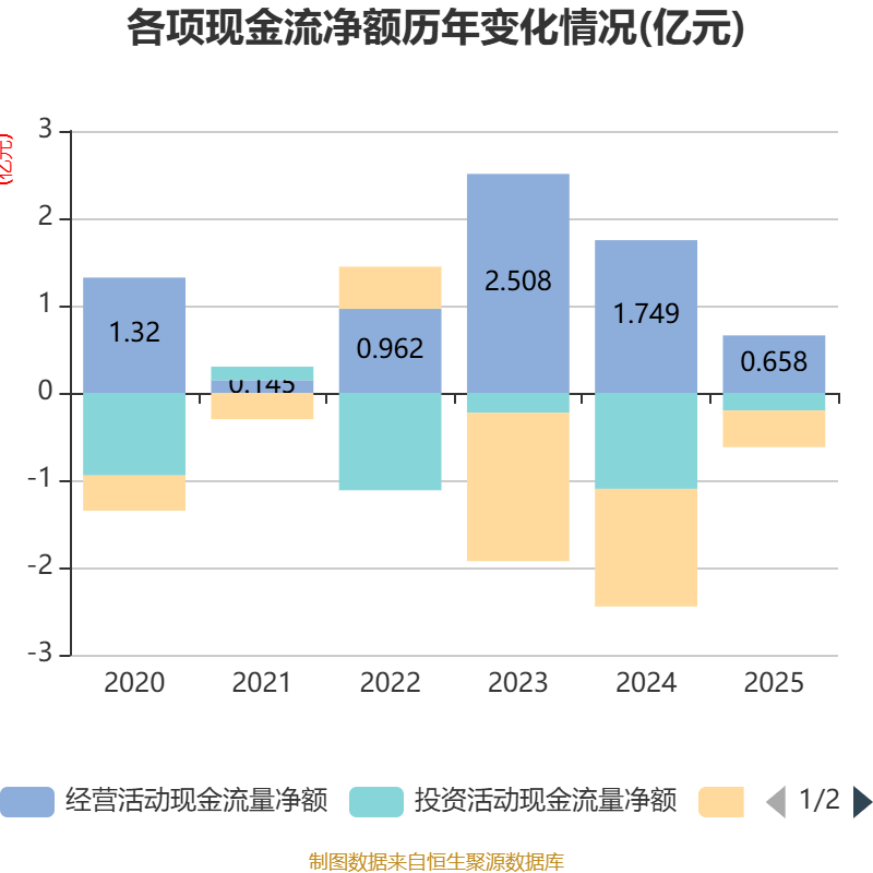 截至2025年,公司经营活动现金流净额为6577.55万元,同比下降62.39%;筹资活动现金流净额-4197.41万元,同比增加9277.75万元;投资活动现金流净额-2015.95万元,上年同期为-1.1亿元。