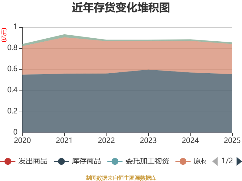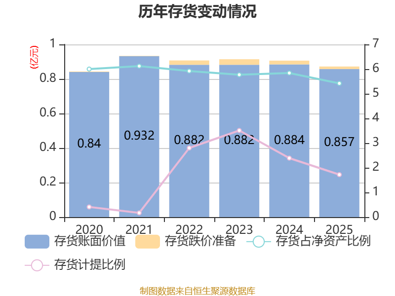 从存货变动来看,截至2025年末,公司存货账面价值为8569.43万元,占净资产的5.42%,较上年末减少271.05万元。其中,存货跌价准备为150.1万元,计提比例为1.72%。