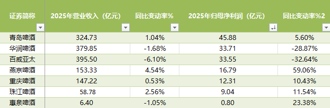 青岛啤酒、燕京啤酒、重庆啤酒、珠江啤酒营收和净利均保持正增长。其中,青岛啤酒2025年实现营业收入324.73亿元,同比增长1.04%;利润增速快于收入增速,归母净利润45.88亿元,同比增长5.6%。
