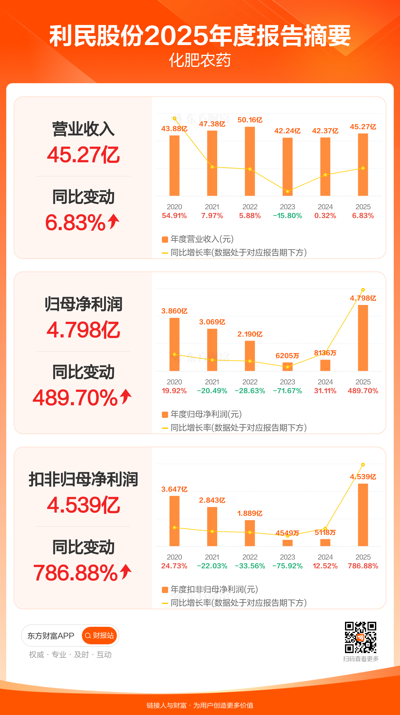 利民股份4月17日发布2025年年报显示,公司全年实现营业收入45.27亿元,同比增长6.83%;归母净利润4.80亿元,同比增长489.70%;扣非归母净利润4.54亿元,同比增长786.88%。