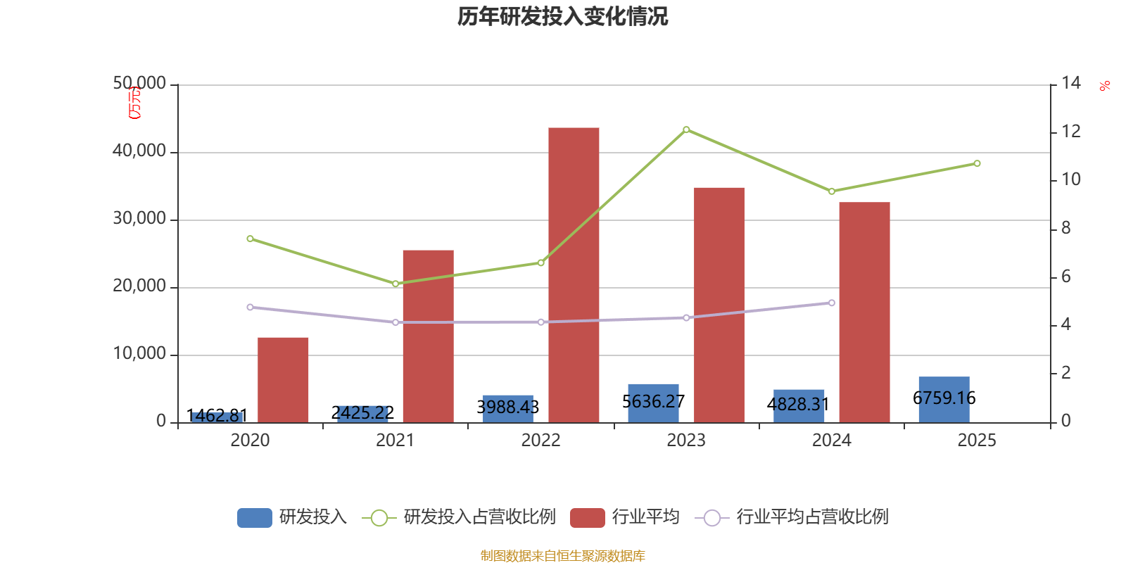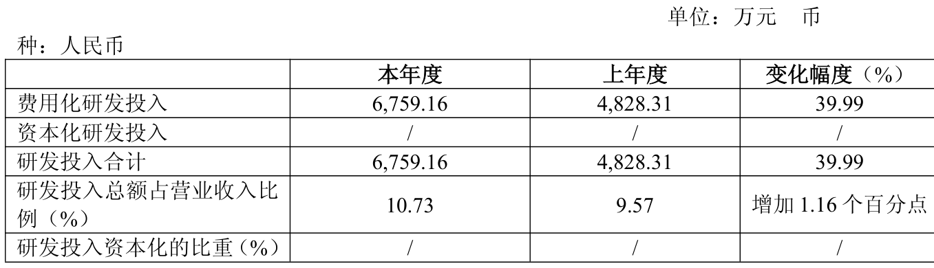 2025年全年,公司研发投入金额为6759.16万元,同比增长39.99%;研发投入占营业收入比例为10.73%,相比上年同期上升1.16个百分点。
