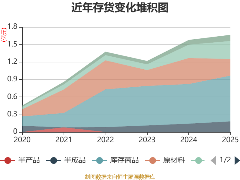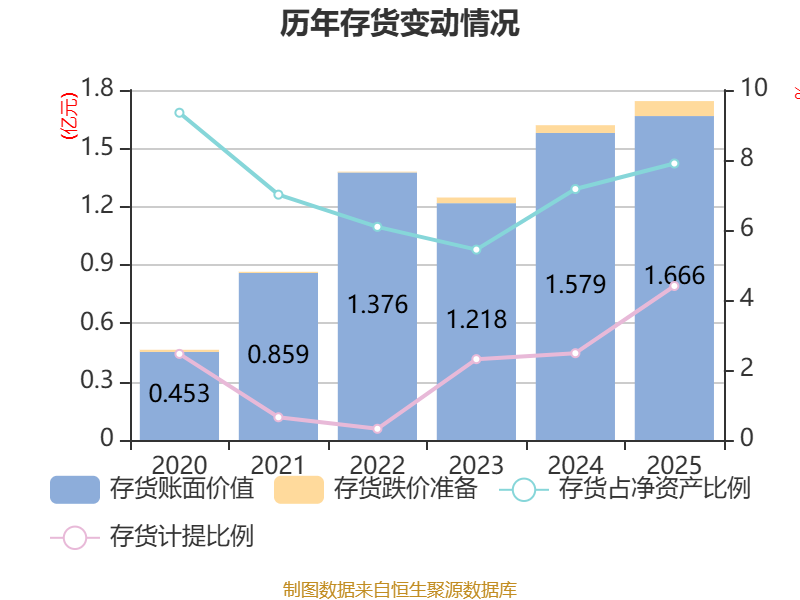 从存货变动来看,截至2025年末,公司存货账面价值为1.67亿元,占净资产的7.9%,较上年末增加864.85万元。其中,存货跌价准备为766.52万元,计提比例为4.4%。