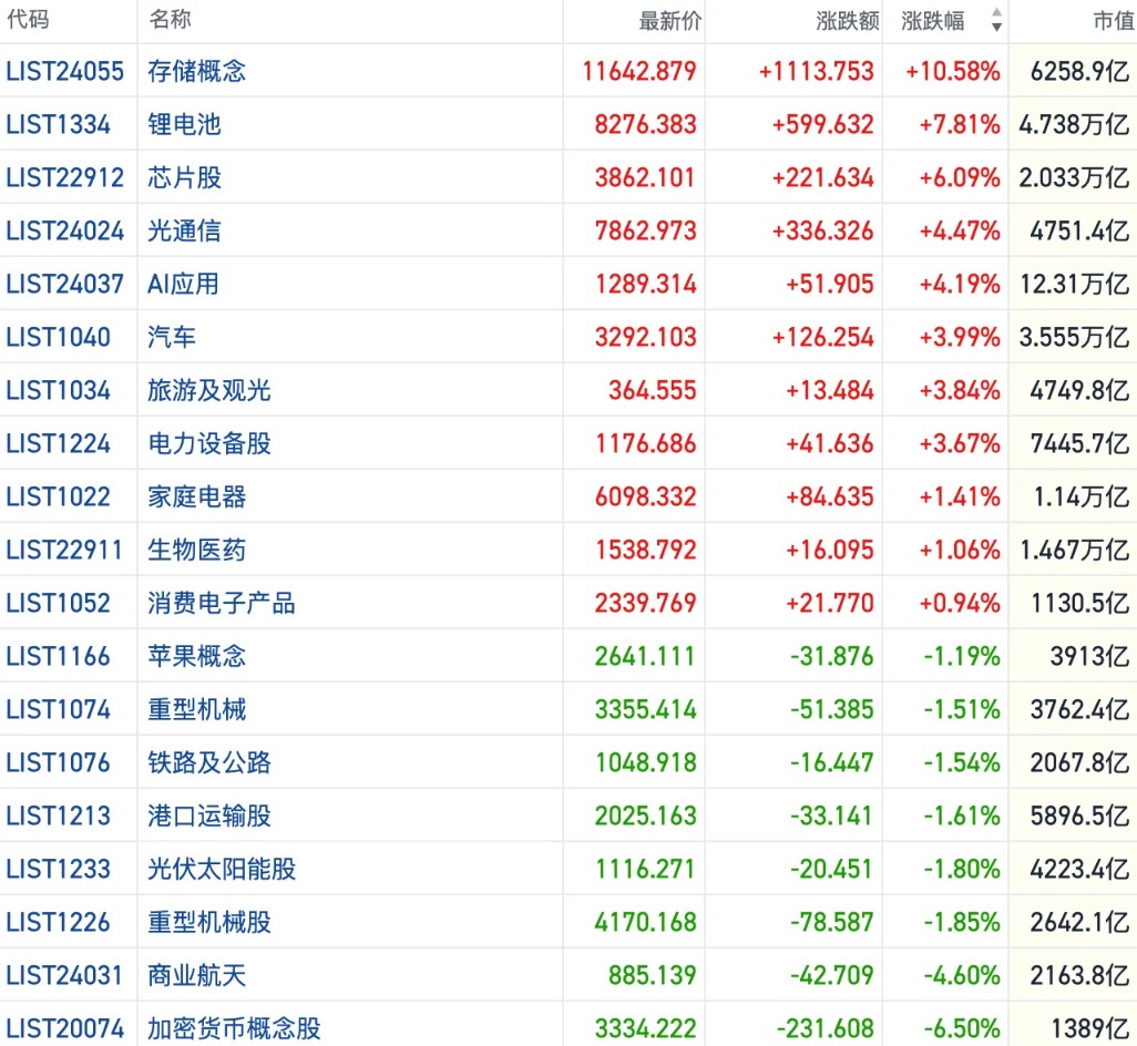 其他方向上,AI主线发力走强,算力、芯片、存储等概念集体上攻。此外,锂电、有色、汽车、金融等板块也纷纷走强。而旅游、教育、餐饮等消费股则延续热度。