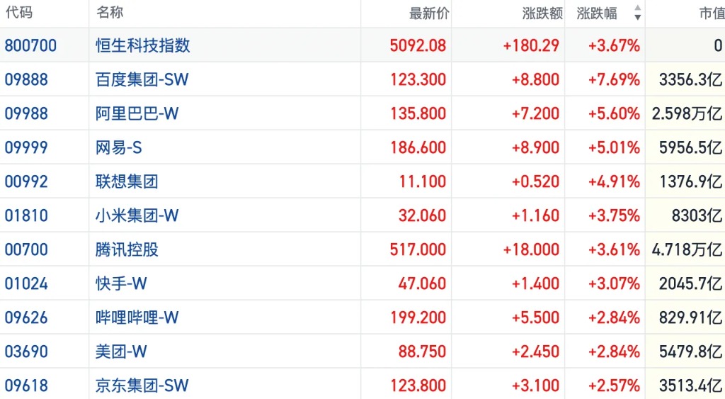 盘面上,今日大型科网股再度全线飘红,百度大涨7.69%表现十分抢眼,阿里巴巴涨5.6%,小米、腾讯涨近4%,美团涨约3%。