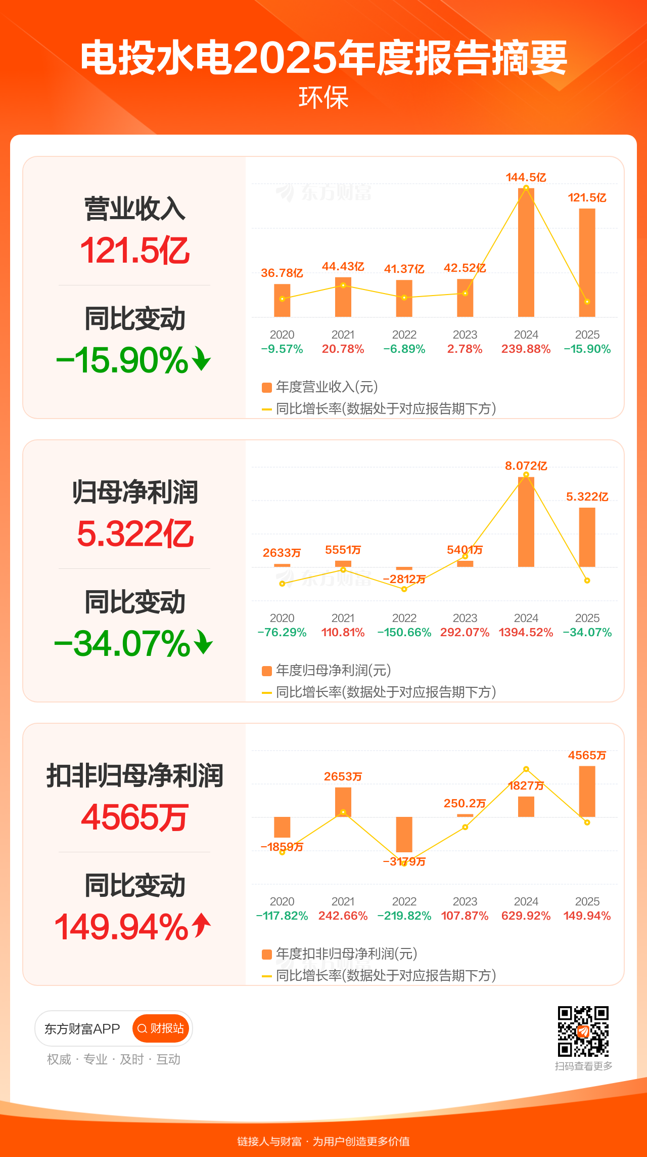 电投水电4月17日发布2025年年报显示,公司全年实现营业收入121.52亿元,同比下滑15.90%;归母净利润5.32亿元,同比下滑34.07%;扣非归母净利润4565.37万元,同比增长149.94%。