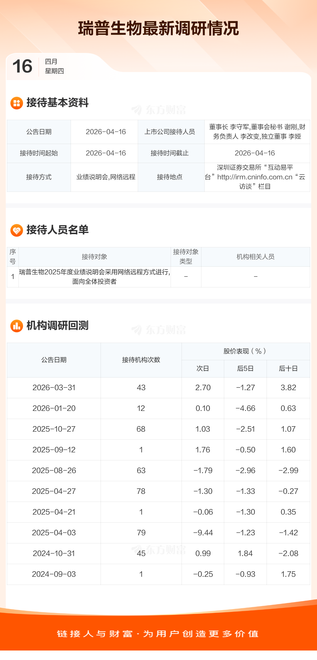 瑞普生物4月16日公告称,4月16日接待瑞普生物2025年度业绩说明会采用网络远程方式进行,面向全体投资者调研。接待人员包括董事长 李守军,董事会秘书 谢刚,财务负责人 李改变,独立董事 李娅。