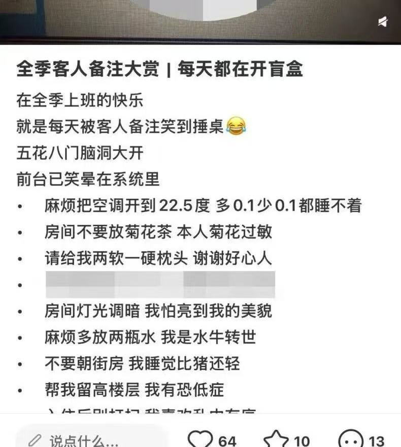 近日,一篇“全季客人备注大赏”的帖文在社交平台引发争议。该账号“全季大连xx酒店”将多名客人的特殊订单备注公开发布,包括“房间不要放菊花茶,本人菊花过敏”“麻烦多放两瓶水,我是水牛转世”“外卖别敲门,放门口,我在修仙勿扰”等内容,配文称“每天被客人备注笑到捶桌”“前台已笑晕在系统里”。
