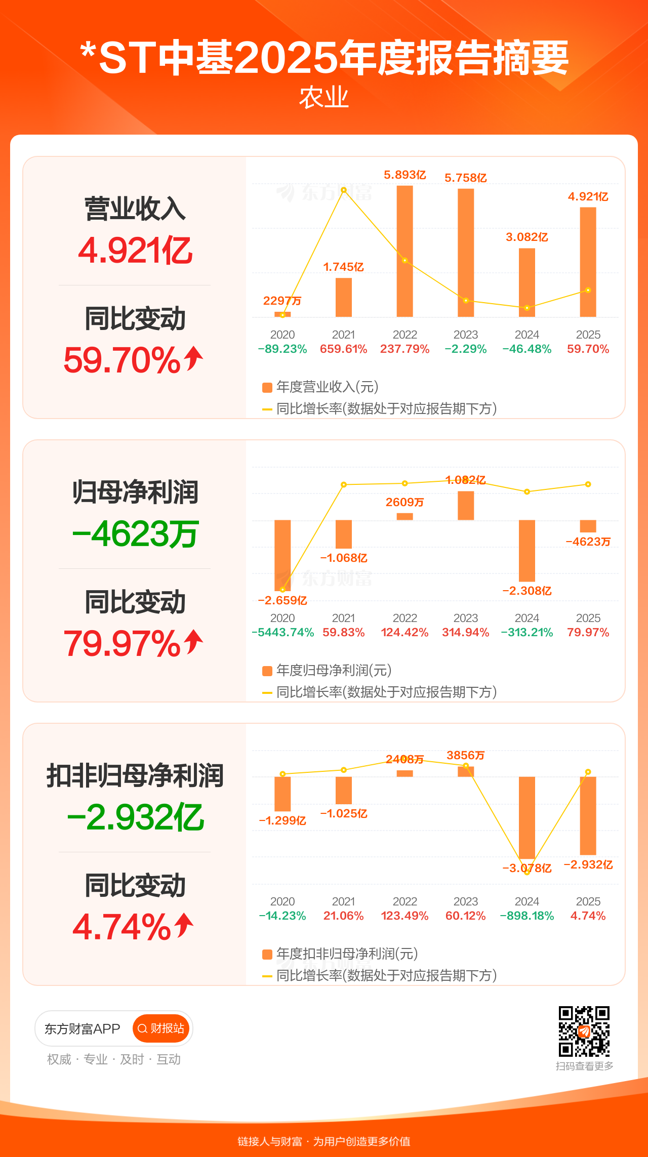 *ST中基4月17日发布2025年年报显示,公司全年实现营业收入4.92亿元,同比增长59.70%;归母净利润-4623.18万元;扣非归母净利润-2.93亿元。