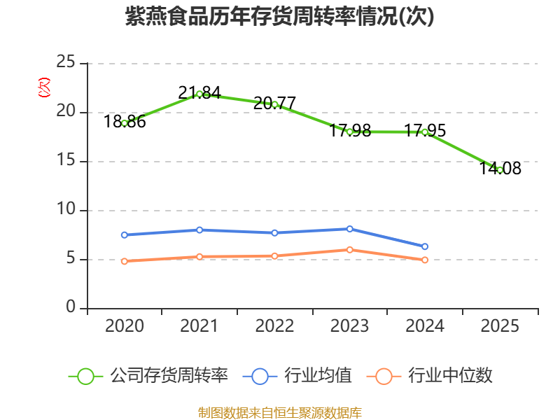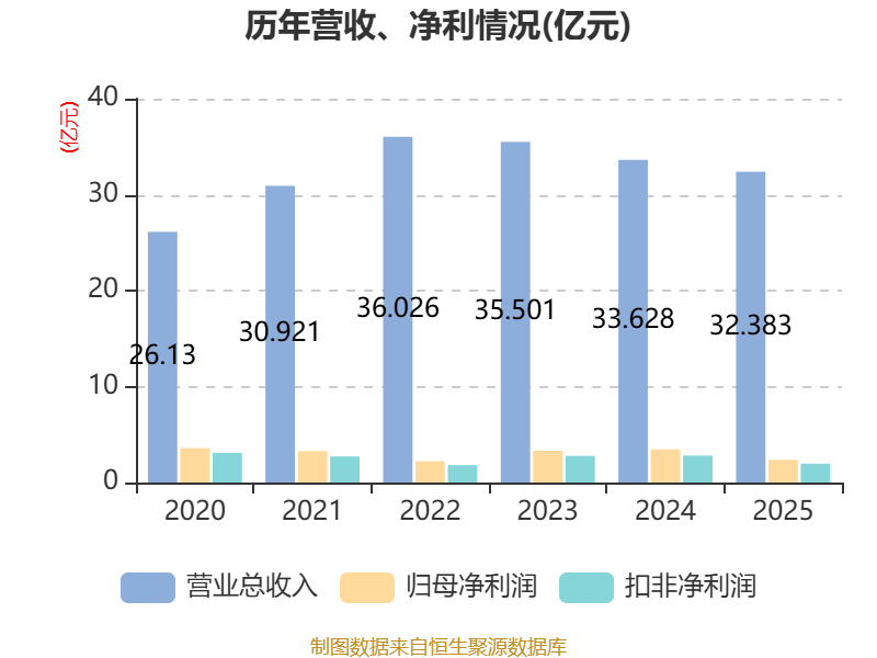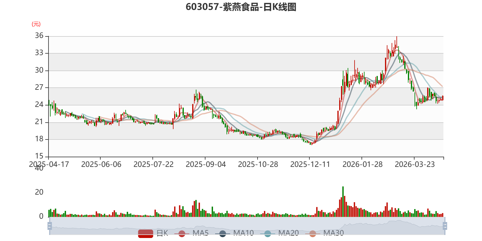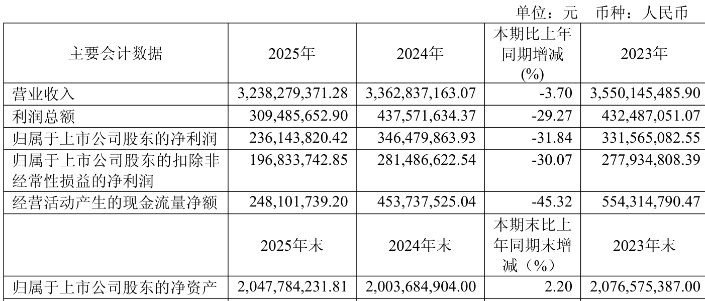 中证智能财讯紫燕食品(603057)4月17日披露2025年年度报告。2025年,公司实现营业总收入32.38亿元,同比下降3.70%;归母净利润2.36亿元,同比下降31.84%;扣非净利润1.97亿元,同比下降30.07%;经营活动产生的现金流量净额为2.48亿元,同比下降45.32%;报告期内,紫燕食品基本每股收益为0.5714元,加权平均净资产收益率为11.78%。公司2025年度分配预案为:拟向全体股东每10股派现1.8元(含税)。