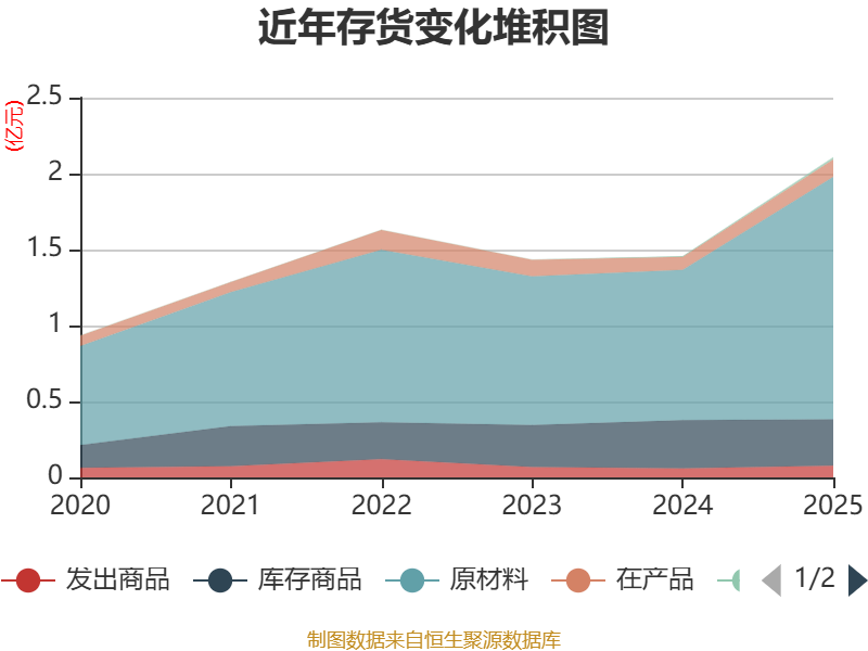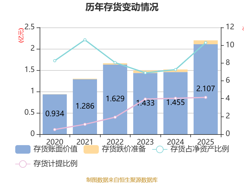从存货变动来看,截至2025年末,公司存货账面价值为2.11亿元,占净资产的10.29%,较上年末增加6518.9万元。其中,存货跌价准备为910.85万元,计提比例为4.14%。