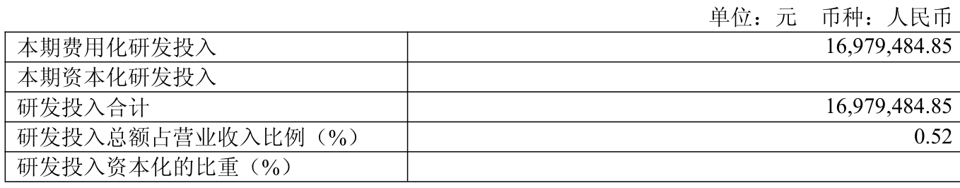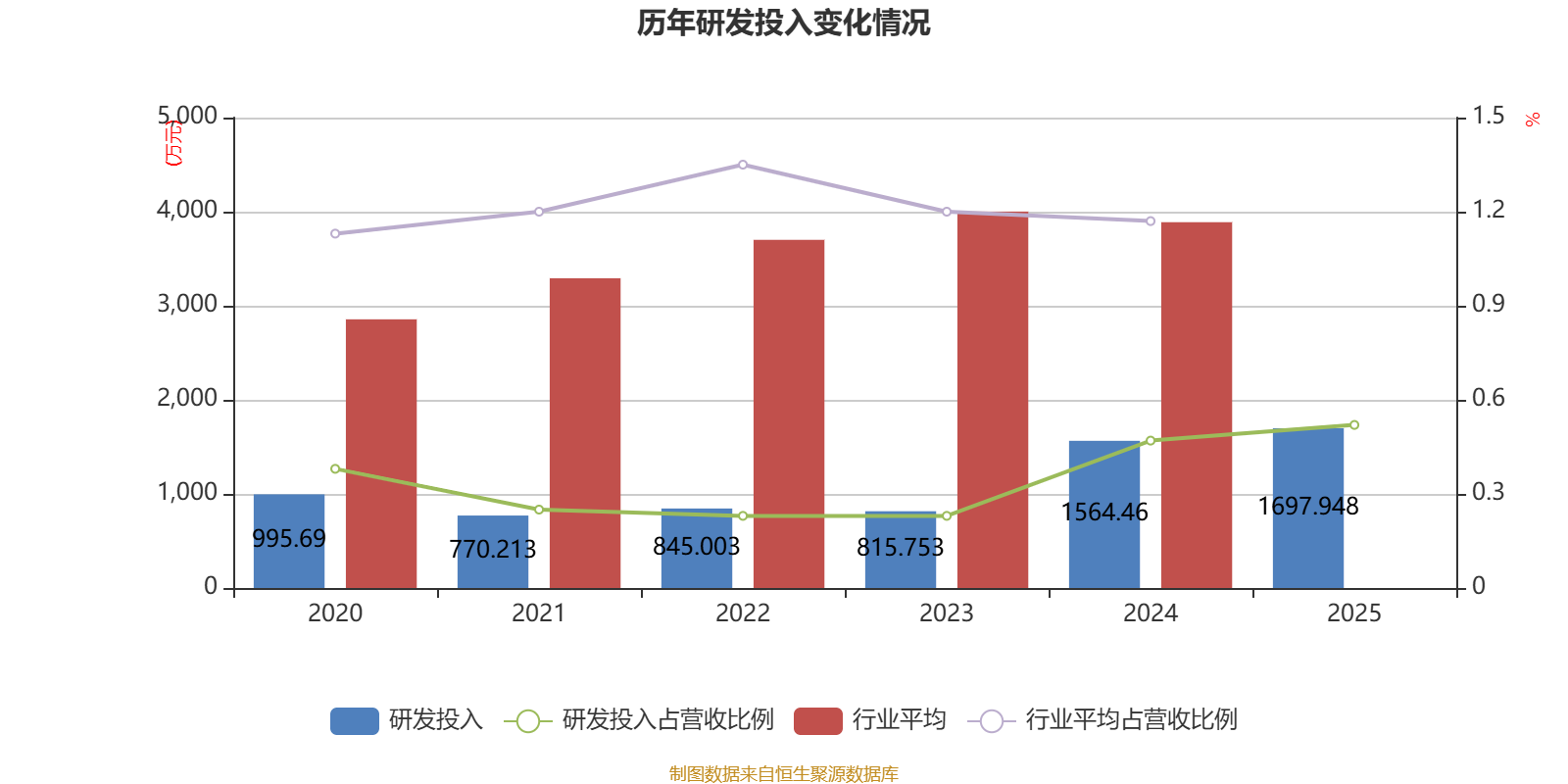 2025年全年,公司研发投入金额为1697.95万元,同比增长8.53%;研发投入占营业收入比例为0.52%,相比上年同期上升0.05个百分点。此外,公司全年研发投入资本化率为0%。