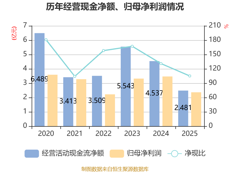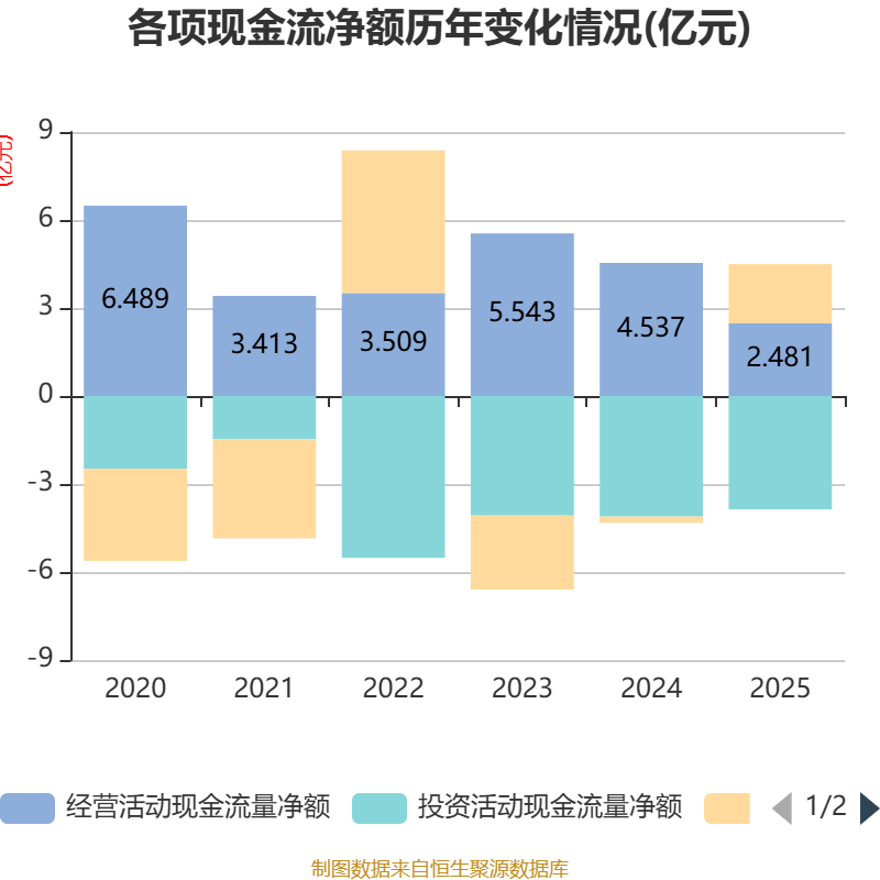 截至2025年,公司经营活动现金流净额为2.48亿元,同比下降45.32%;筹资活动现金流净额2.02亿元,同比增加2.23亿元;投资活动现金流净额-3.86亿元,上年同期为-4.11亿元。