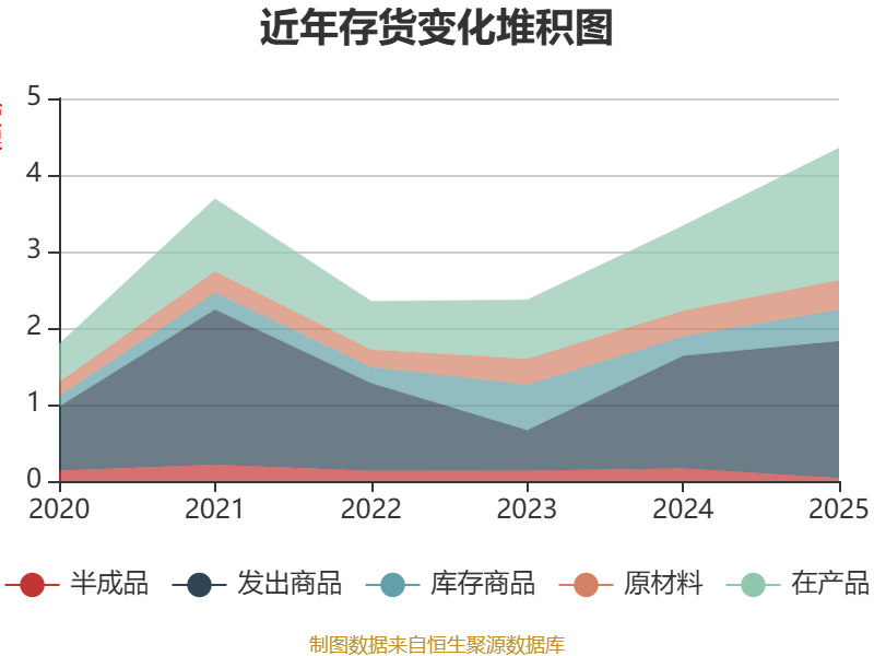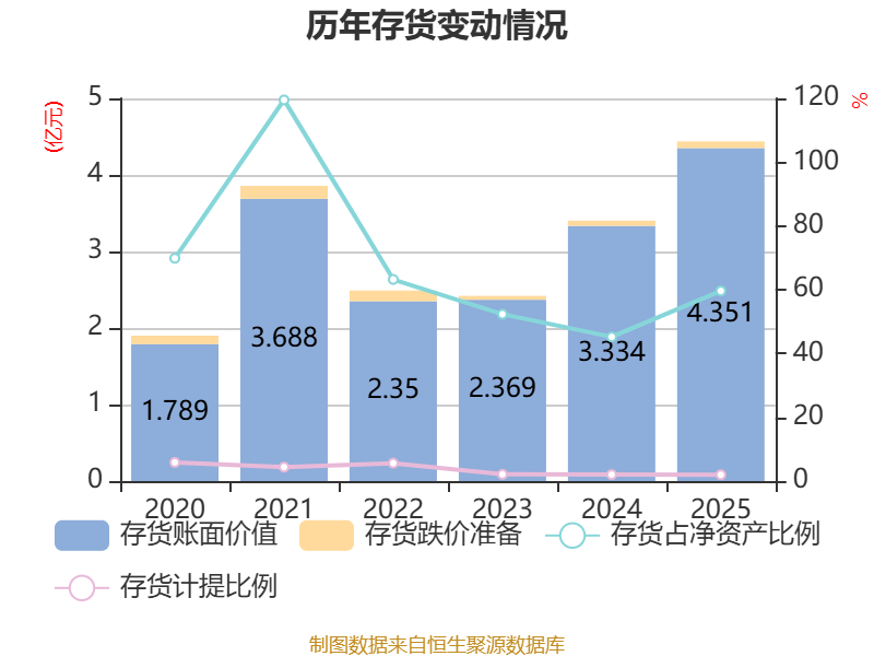 从存货变动来看,截至2025年末,公司存货账面价值为4.35亿元,占净资产的59.62%,较上年末增加1.02亿元。其中,存货跌价准备为873.84万元,计提比例为1.97%。