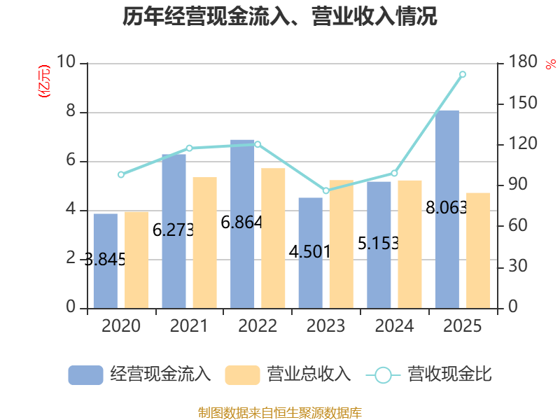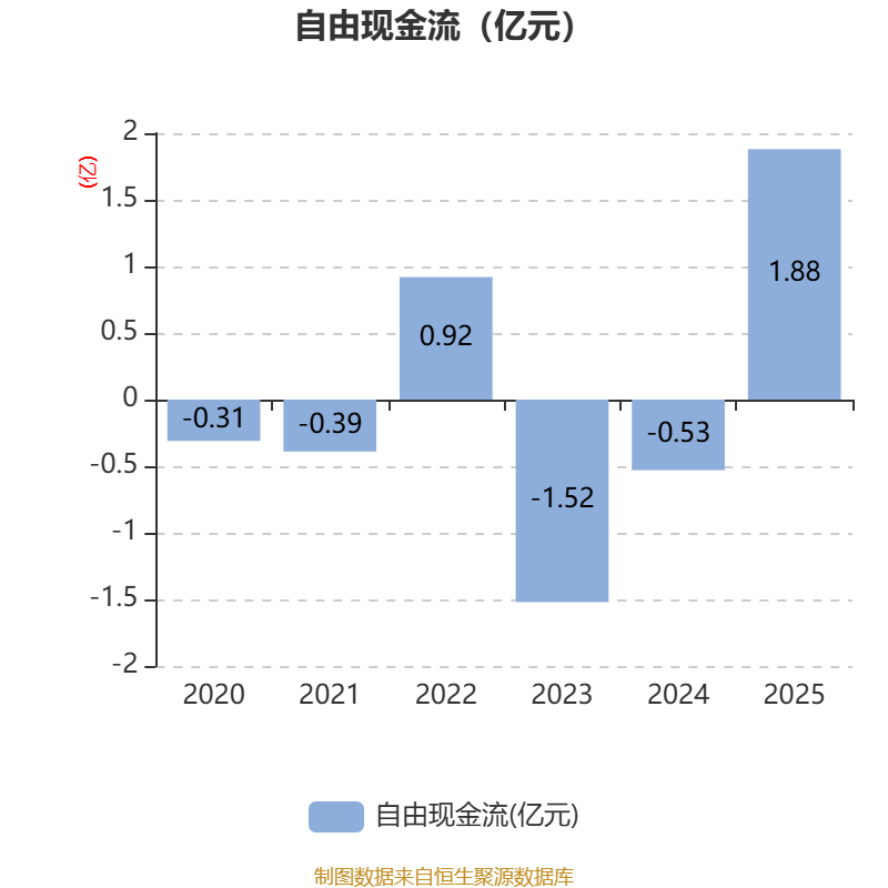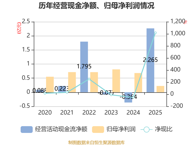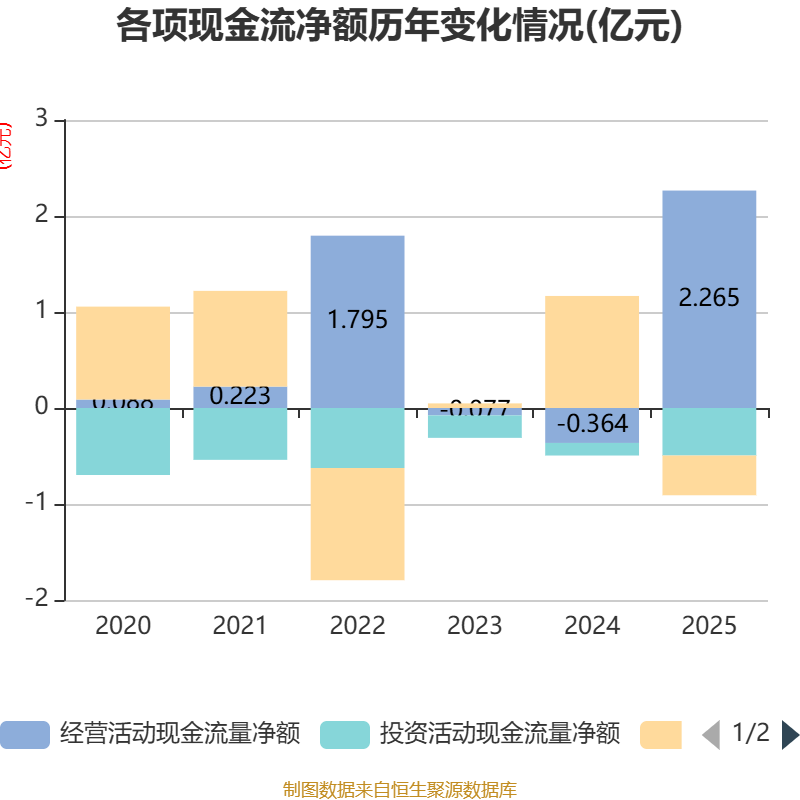 截至2025年,公司经营活动现金流净额为2.27亿元,同比增加2.63亿元;筹资活动现金流净额-4135.27万元,同比减少1.58亿元;投资活动现金流净额-4948.75万元,上年同期为-1307.01万元。