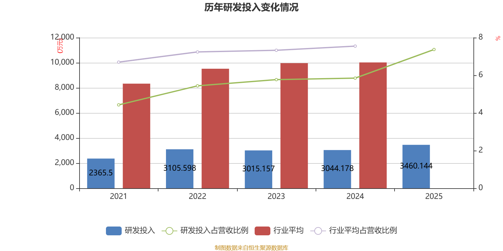 2025年全年,公司研发投入金额为3460.14万元,同比增长13.66%;研发投入占营业收入比例为7.37%,相比上年同期上升1.52个百分点。此外,公司全年研发投入资本化率为0%。