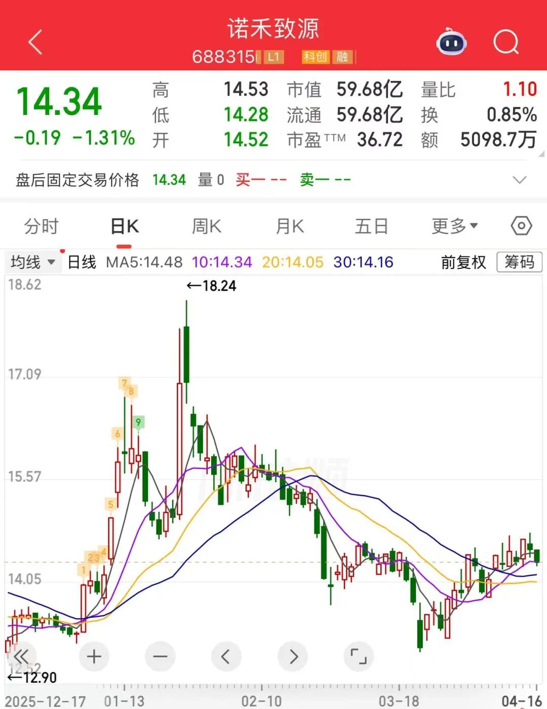 自年报披露以来,诺禾致源股价已连续两日下跌。Wind数据显示,4月16日,诺禾致源股价收盘报14.34元/股,跌幅为1.31%。