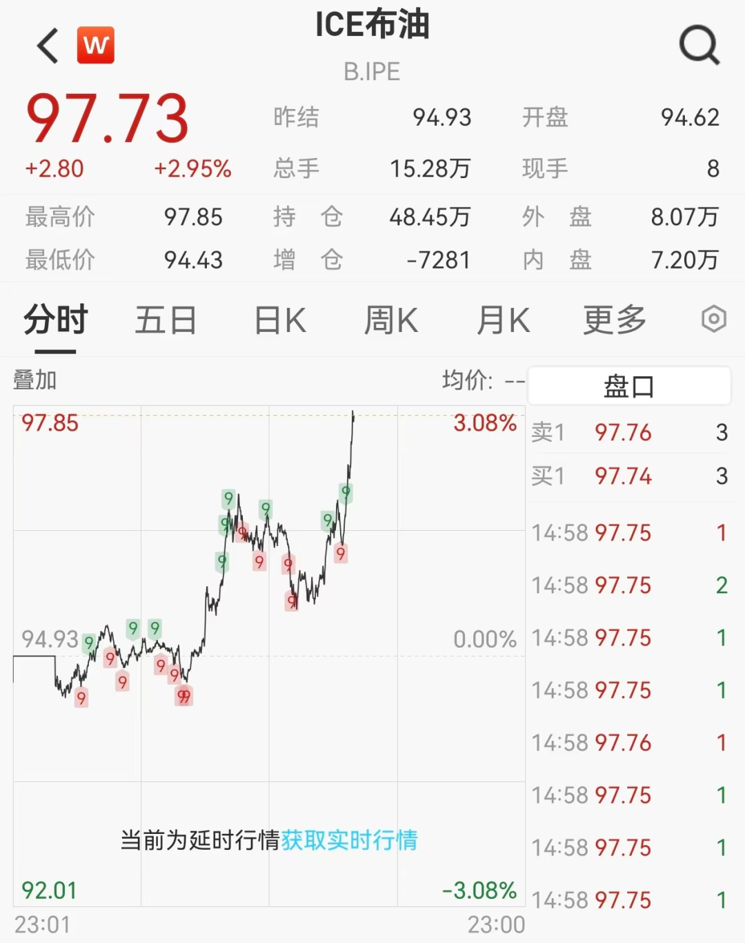 国际原油价格快速拉升,ICE布油突破97美元/桶,日内涨近3%。WTI原油日内涨超2%。