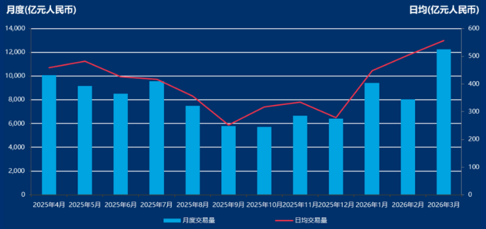 新华财经北京4月16日电(王菁)债券市场对外开放持续深化,跨境投资渠道进一步畅通。2026年3月,债券通“北向通”成交活跃,月度交易量达12241亿元人民币,日均成交556亿元,两项指标均创历史新高,显示出国际投资者对中国债券市场的强劲信心。