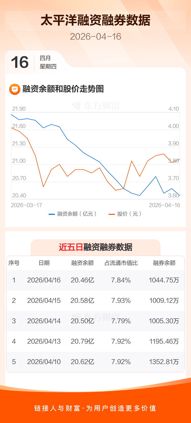 交易所最新数据显示,太平洋于2026年4月16日获融资买入3668.18万元,融资偿还4852.46万元,当日融资净偿还1184.28万元。目前,该股融资余额20.46亿,占流通市值比例为7.84%。