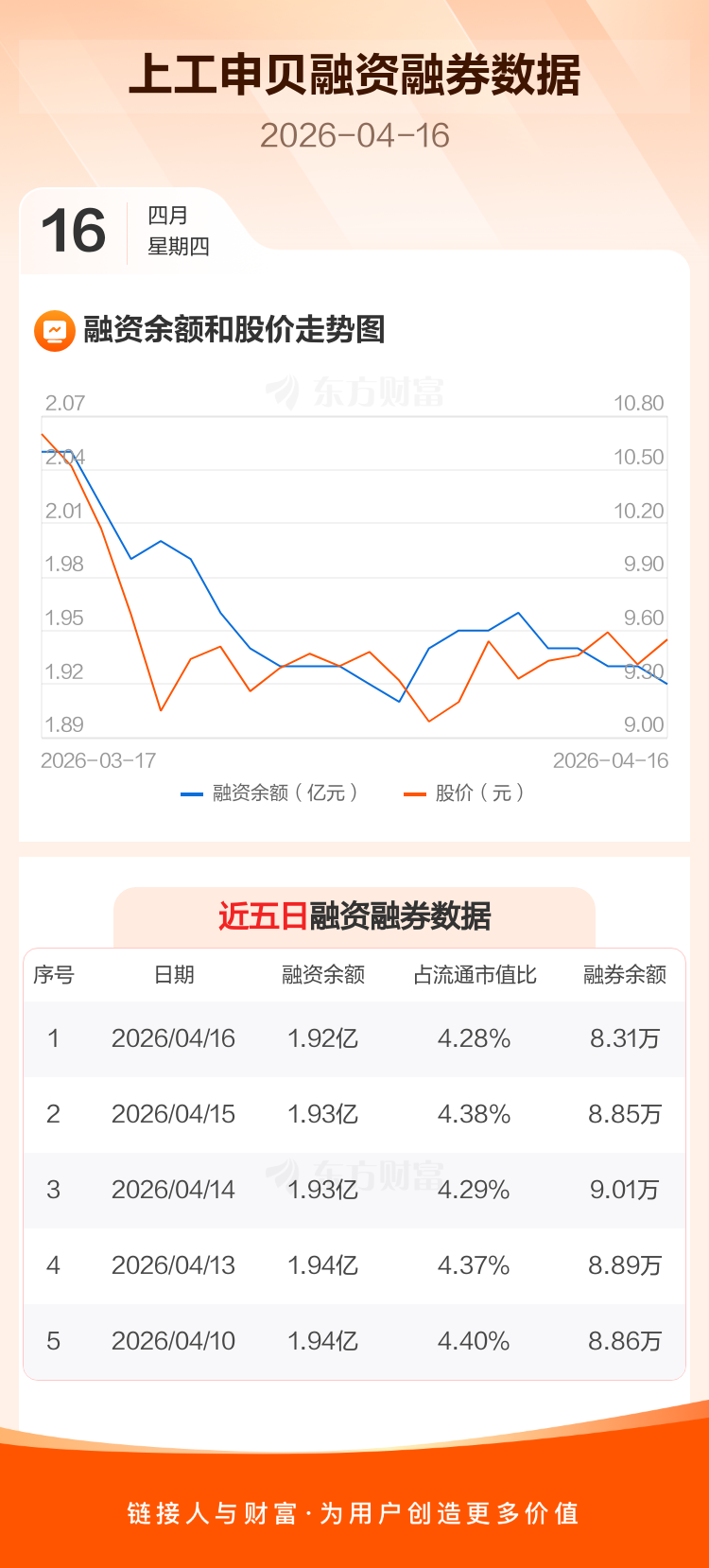 交易所最新数据显示,上工申贝于2026年4月16日获融资买入402.79万元,融资偿还524.32万元,当日融资净偿还121.53万元。目前,该股融资余额1.92亿,占流通市值比例为4.28%。