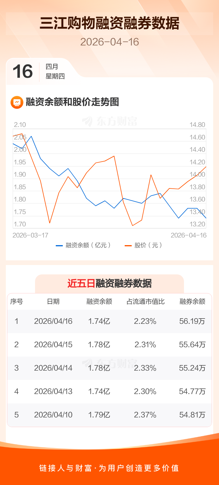 交易所最新数据显示,三江购物于2026年4月16日获融资买入1191.71万元,融资偿还1602.30万元,当日融资净偿还410.6万元。目前,该股融资余额1.74亿,占流通市值比例为2.23%。