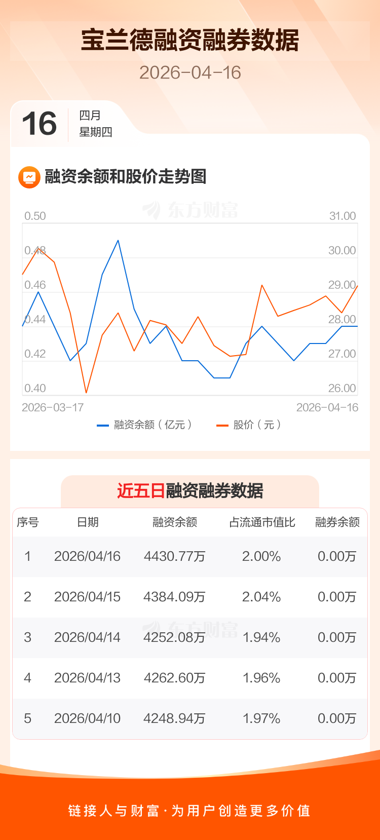 交易所最新数据显示,宝兰德于2026年4月16日获融资买入323.53万元,融资偿还276.84万元,当日融资净买入46.68万元。目前,该股融资余额4430.77万,占流通市值比例为2.00%。