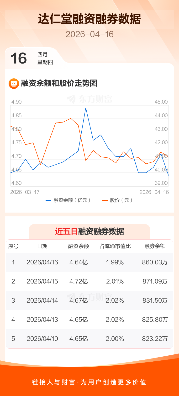 交易所最新数据显示,达仁堂于2026年4月16日获融资买入1237.45万元,融资偿还2050.70万元,当日融资净偿还813.26万元。目前,该股融资余额4.64亿,占流通市值比例为1.99%。