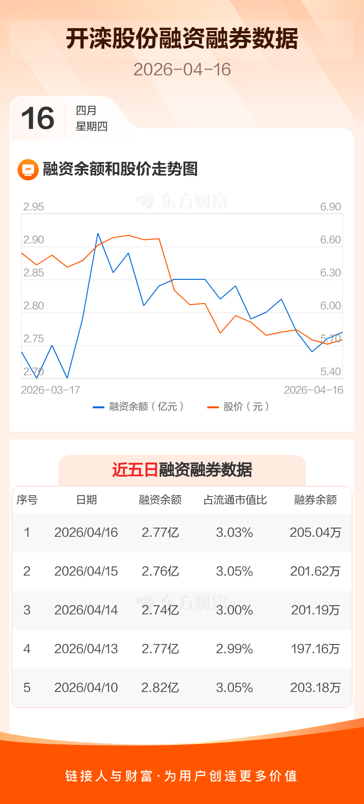交易所最新数据显示,开滦股份于2026年4月16日获融资买入324.80万元,融资偿还265.24万元,当日融资净买入59.56万元。目前,该股融资余额2.77亿,占流通市值比例为3.03%。