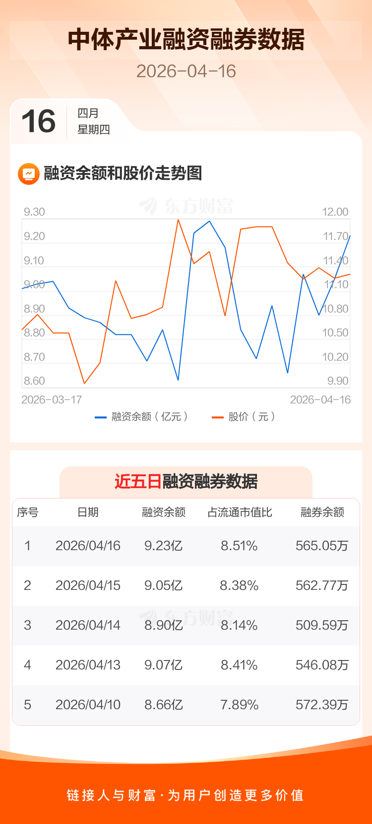 交易所最新数据显示,中体产业于2026年4月16日获融资买入7833.87万元,融资偿还5997.38万元,当日融资净买入1836.49万元。目前,该股融资余额9.23亿,占流通市值比例为8.51%。