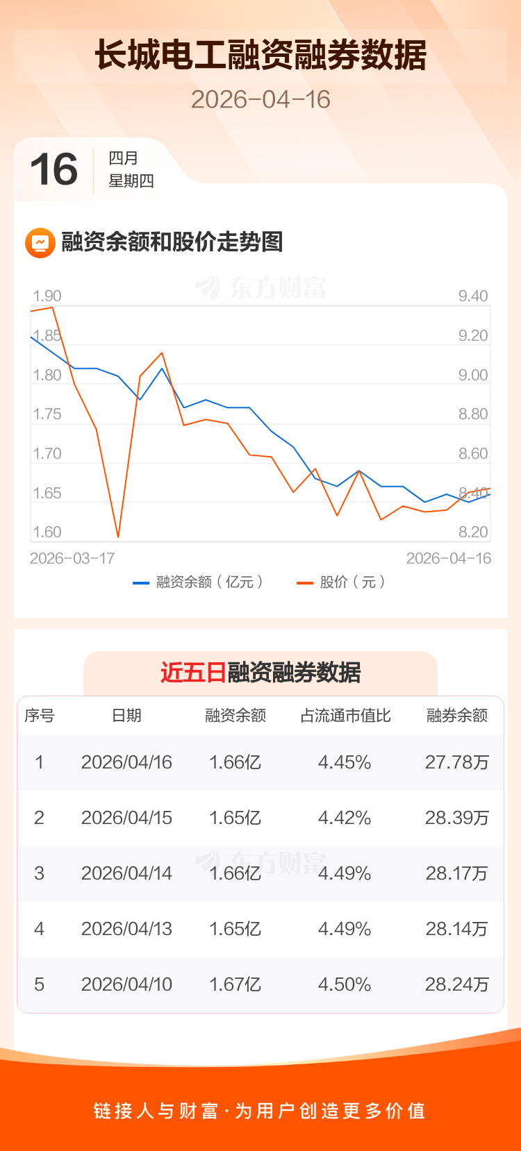 交易所最新数据显示,长城电工于2026年4月16日获融资买入453.69万元,融资偿还306.76万元,当日融资净买入146.93万元。目前,该股融资余额1.66亿,占流通市值比例为4.45%。