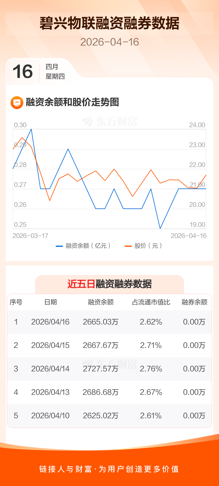 交易所最新数据显示,碧兴物联于2026年4月16日获融资买入333.56万元,融资偿还336.20万元,当日融资净偿还2.64万元。目前,该股融资余额2665.03万,占流通市值比例为2.62%。