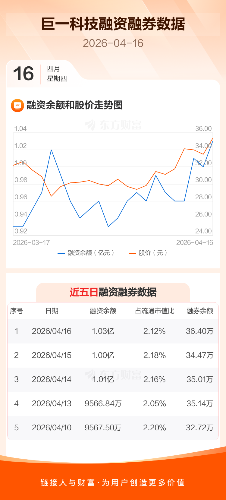 交易所最新数据显示,巨一科技于2026年4月16日获融资买入1697.30万元,融资偿还1419.08万元,当日融资净买入278.22万元。目前,该股融资余额1.03亿,占流通市值比例为2.12%。