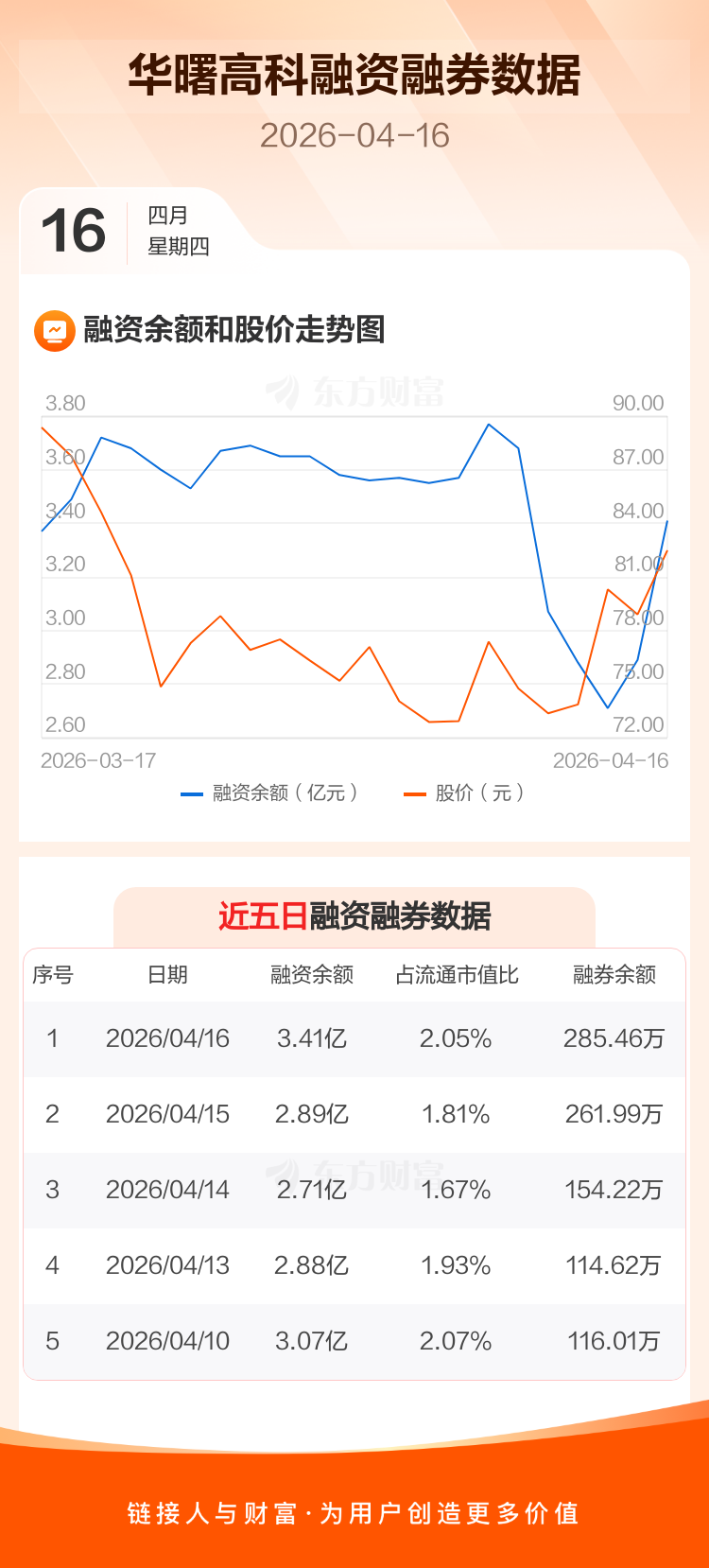 交易所最新数据显示,华曙高科于2026年4月16日获融资买入8268.33万元,融资偿还3020.16万元,当日融资净买入5248.17万元。目前,该股融资余额3.41亿,占流通市值比例为2.05%。
