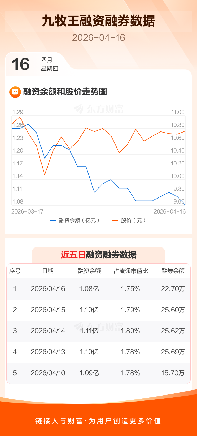 交易所最新数据显示,九牧王于2026年4月16日获融资买入537.46万元,融资偿还736.66万元,当日融资净偿还199.2万元。目前,该股融资余额1.08亿,占流通市值比例为1.75%。