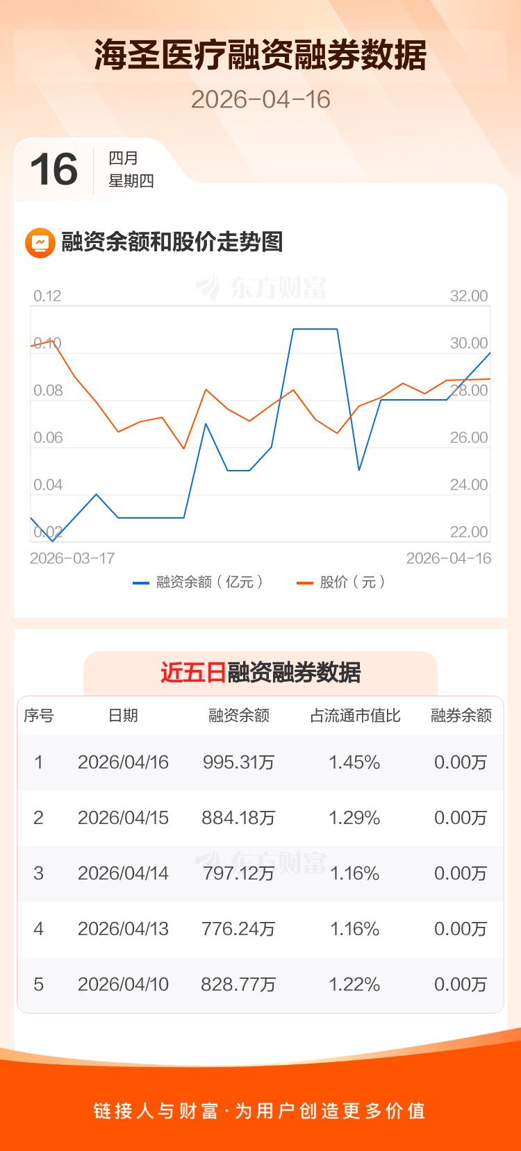 交易所最新数据显示,海圣医疗于2026年4月16日获融资买入156.31万元,融资偿还45.18万元,当日融资净买入111.13万元。目前,该股融资余额995.31万,占流通市值比例为1.45%。