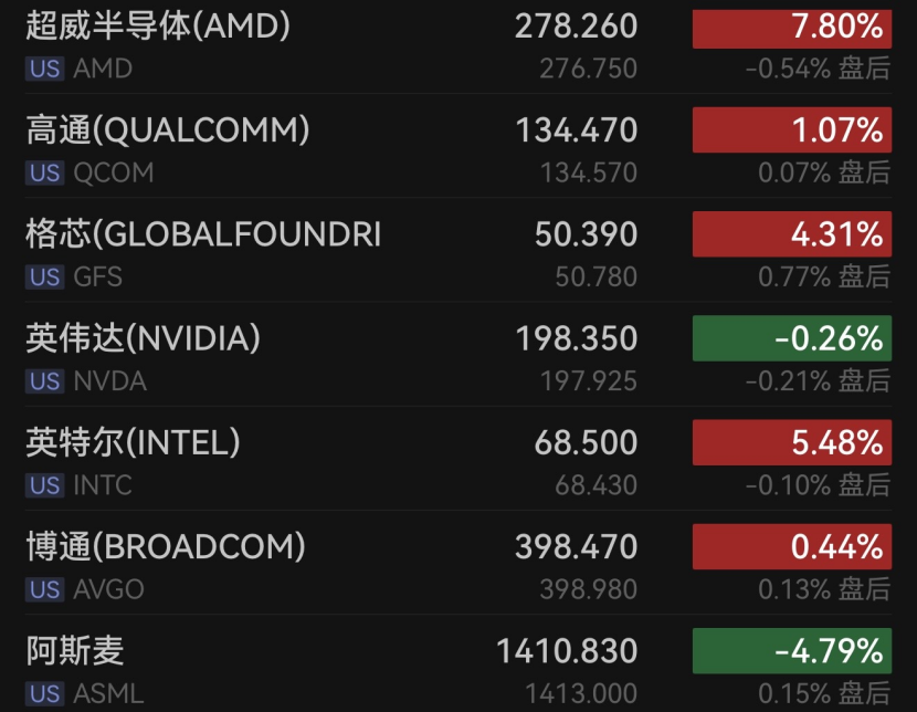 费城半导体指数涨0.97%,刷新历史新高,超威半导体涨超7%,英特尔涨逾5%,微芯科技涨逾3%,高通涨超1%。跌幅方面,阿斯麦跌超4%,台积电跌逾3%。