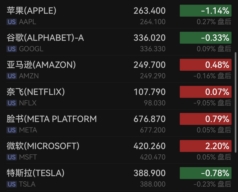 大型科技股涨跌互现,微软涨超2%,脸书涨0.79%,亚马逊涨0.48%;苹果跌超1%,谷歌跌0.33%,特斯拉跌0.78%,英伟达跌0.26%。
