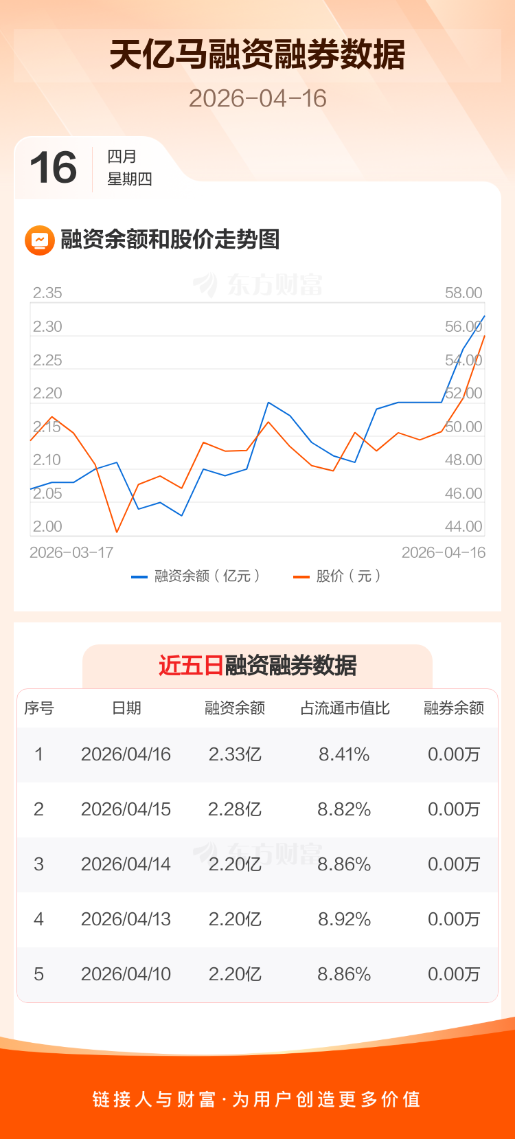 交易所最新数据显示,天亿马于2026年4月16日获融资买入2765.61万元,融资偿还2268.92万元,当日融资净买入496.69万元。目前,该股融资余额2.33亿,占流通市值比例为8.41%。
