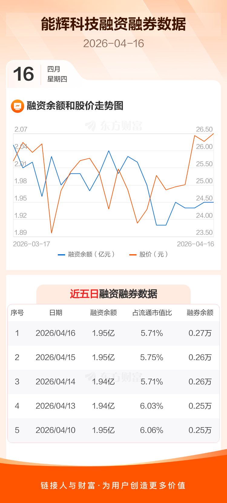 交易所最新数据显示,能辉科技于2026年4月16日获融资买入846.18万元,融资偿还797.73万元,当日融资净买入48.45万元。目前,该股融资余额1.95亿,占流通市值比例为5.71%。
