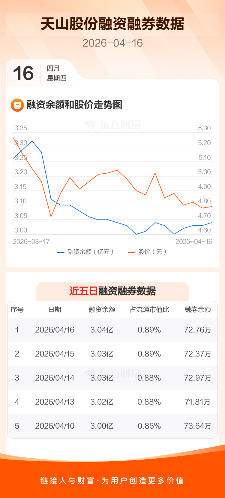 交易所最新数据显示,天山股份于2026年4月16日获融资买入397.32万元,融资偿还316.18万元,当日融资净买入81.14万元。目前,该股融资余额3.04亿,占流通市值比例为0.89%。